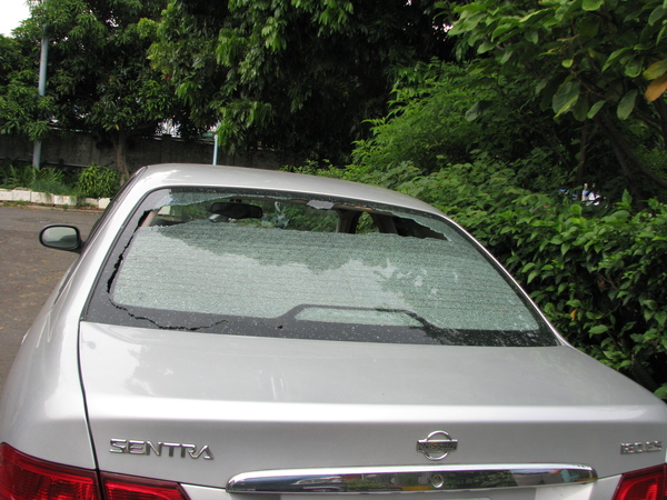 玻璃瞬間破裂!我和兒子到達目地,熄火並停好車,卻在關好車門的那一剎那,後擋風玻璃卻一整個爆裂。我和兒子同時往上看,還以為是附近小孩丟石頭,還是有什麼東西從高樓上掉下來?結果什麼都沒找到。用完餐,沿途開車回家時,卻被路上的坑洞,一顛一顛的破的更大了。回程途中,兒子頻頻擔心是自己練習時按了什麼按鈕?