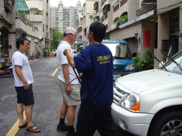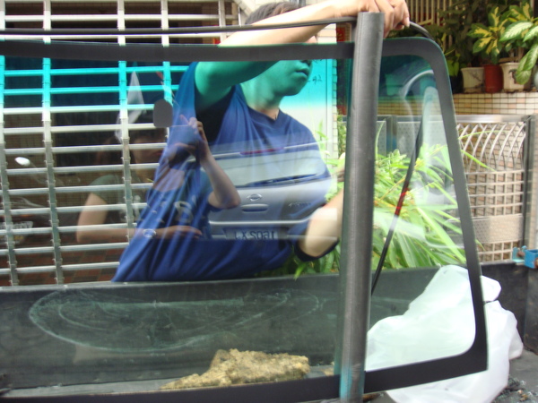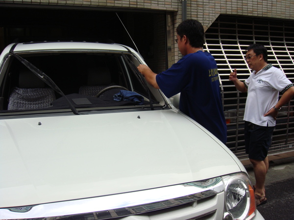 現場表演秀!師現場表演秀!師傅和採訪小姐開了一台小貨車來幫我換修玻璃。玻璃師傅希望車子可以車門兩邊都可以打開,所以我把車頭移出車庫。沒想到引來街坊的好奇,大家都沒想到現在換汽車玻璃可以換到家裡來。