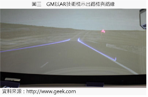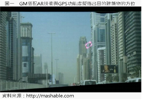 (2010/4/29) 美國GM(General Motor)汽車目前正與許多大學合作研發,計畫將擴增實境技術(Augmented Reality)應用於汽車擋風玻璃上。偵測追蹤駕駛人的眼球觀察路徑並紀錄下來與虛擬指標作比對。